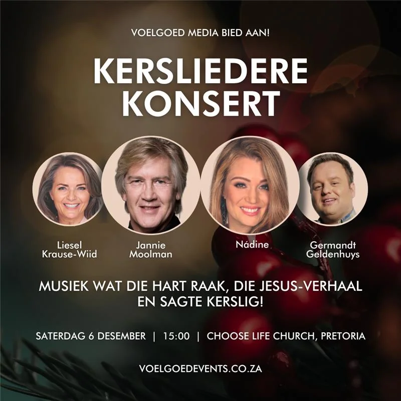 Voelgoed Media se éérste Kersliedere Konsert – met musiek wat die hart raak, die Jesus-verhaal wat inspireer en sagte kerslig! Laat jouself meevoer deur die pragtige uitvoering van Kersliedere deur geliefde kunstenaars soos Jannie Moolman, Germandt Geldenhuys en Nádine. Met sielvolle Bybelvoorlesings en aangrypende storievertelling deur Liesel Krause-Wiid.
